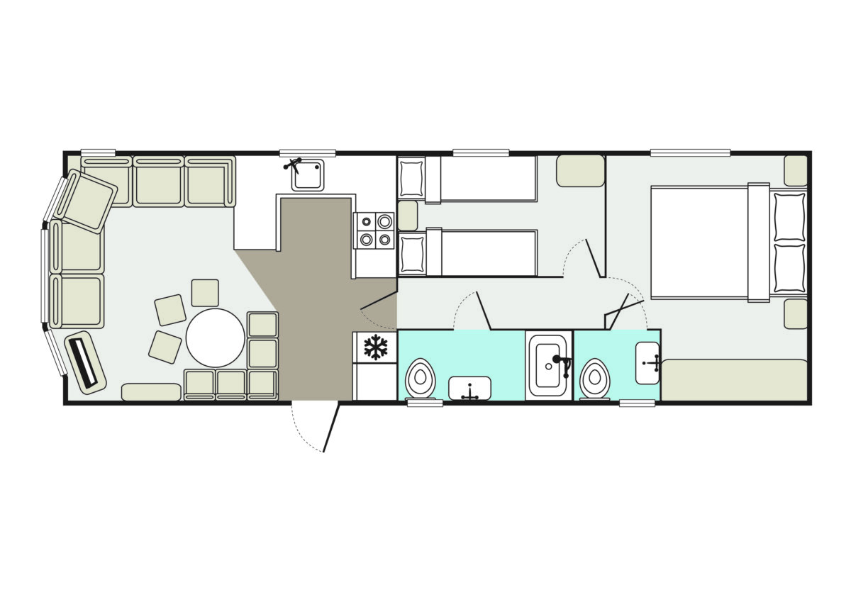 3 bedroom caravan, which enjoys many of the benefits of our flagship lodges. Included in these superior caravans is an outside patio with furniture, master bedroom with en-suite WC, double glazing and pet friendly.