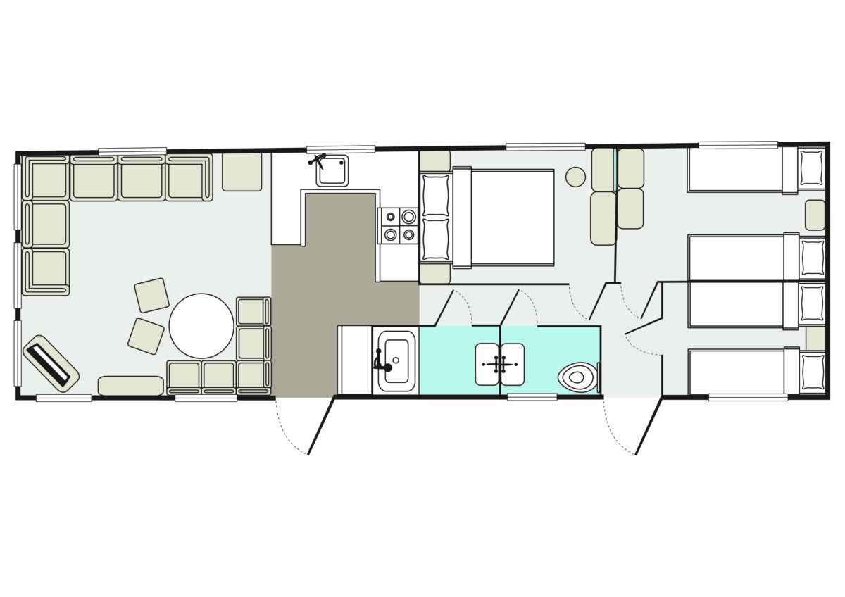 Our Silver Reef Caravans have 3 bedrooms – 1 large double bedroom and 2 twin bedrooms with the living area central to the accommodation. The master bedroom has an en-suite shower room with an additional separate shower room for the twin bedrooms.